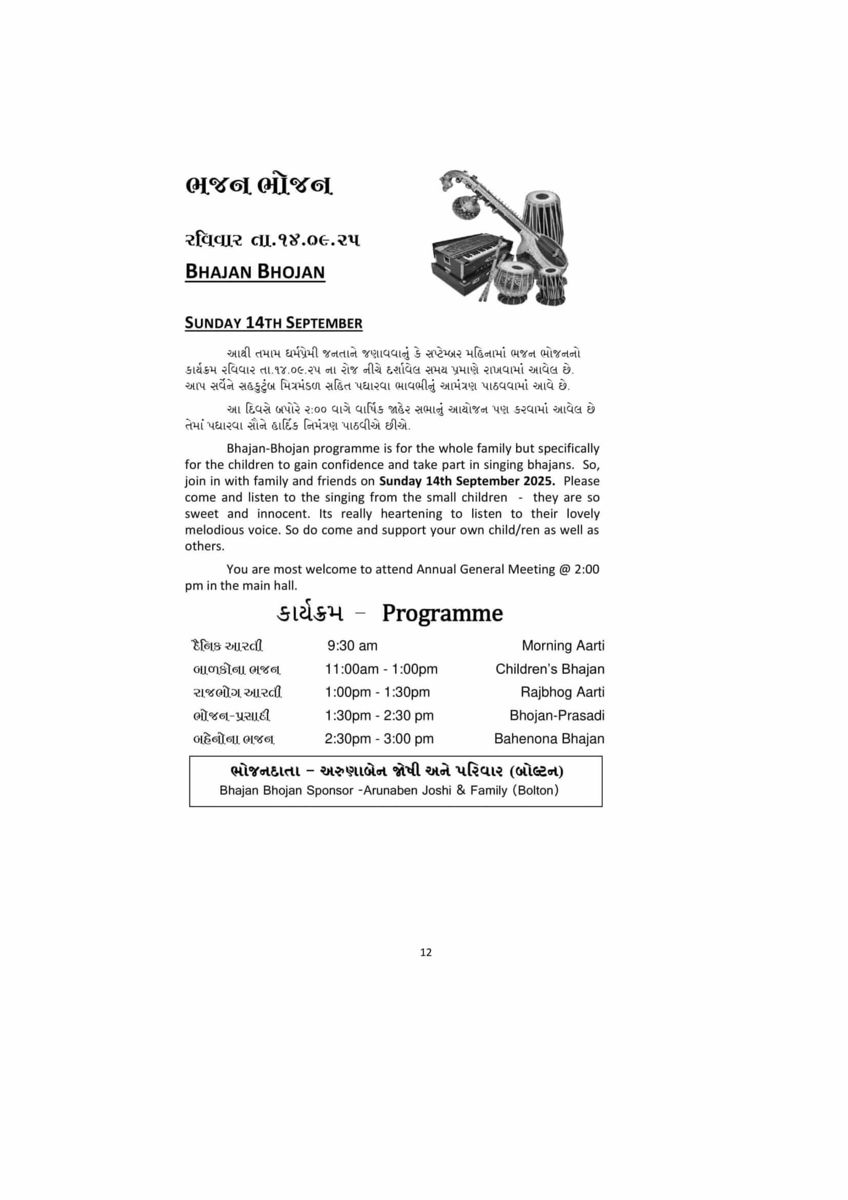 Bhajan-Bholan programrne is for the whole family but specifically for the children to gain confidence and take part in singing bhajans. So, join jn with family and friends on Sunday 14th September 2025. Please come and listen to the singing from the small children – they are so sweet and innocent. Its really heartening to listen to their lovely melodious voice. So do come and support your own child/ren as well as others.