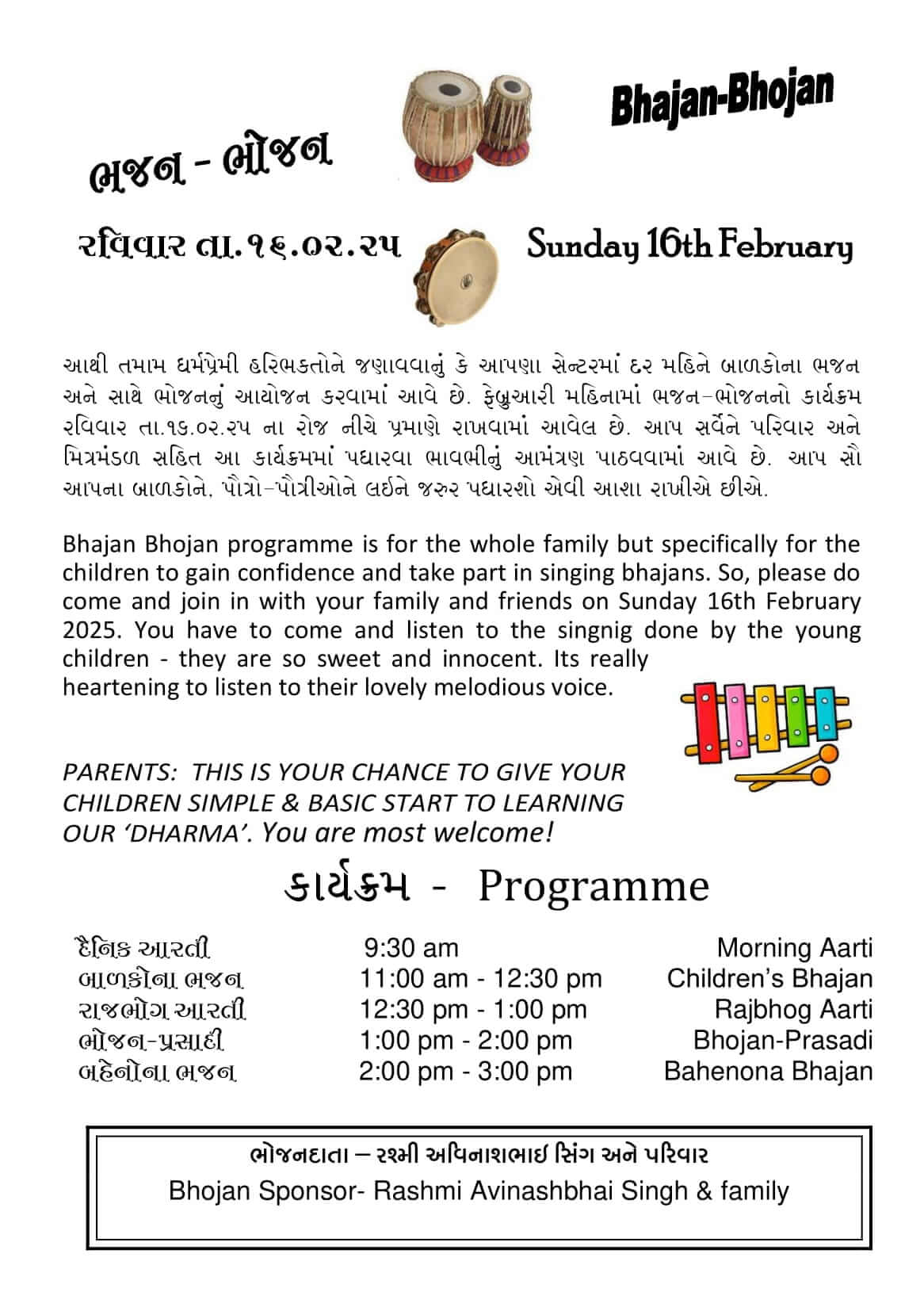 Bhajan Bhojan programme is for the whole family but specifically for the children to gain confidence and take part in singing bhajans. So, please do come and join in with your family and friends on Sunday 16th February 2025. You have to come and listen to the singnig done by the young children – they are so sweet and innocent. Its really heartening to listen to their lovely melodious voice.