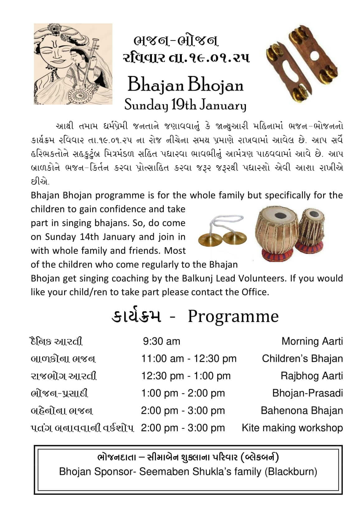 Bhajan Bhojan programme is for the whole family but specifically for the children to gain confidence and take part in singing bhajans. So, do come on Sunday 19th January and join in with whole family and friends. Most of the children who come regularly to the Bhajan Bhojan get singing coaching by the Balkunj Lead Volunteers. If you would like your child/ren to take part please contact the Office.