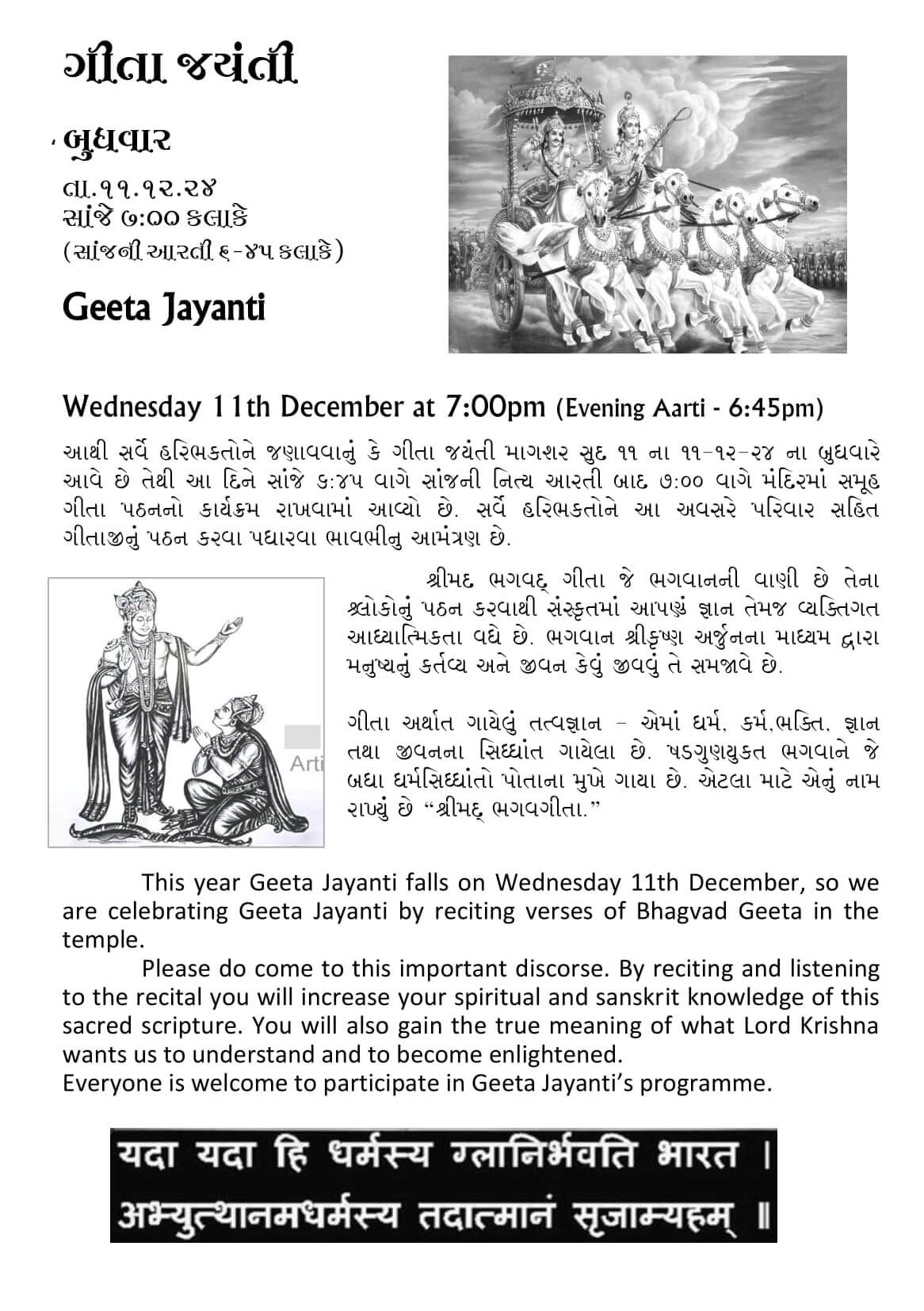 This year Geeta Jayanti falls on Wednesday 11th December, so we are celebrating Geeta Jayanti by reciting verses of Bhagvad Geeta in the temple.