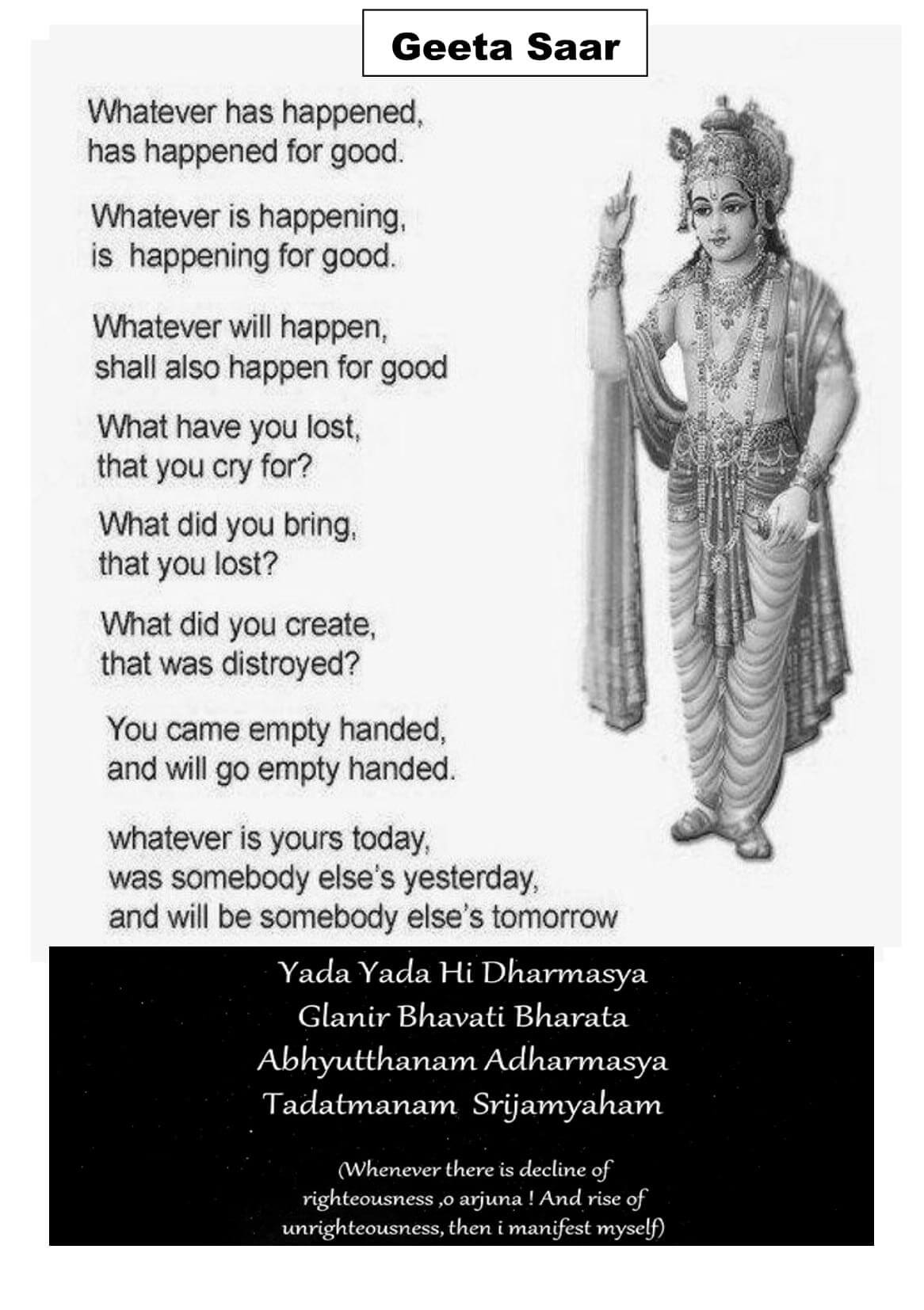 Please do come to this important discorse. By reciting and listening to the recital you will increase your spiritual and sanskrit knowledge of this sacred scripture. You will also gain the true meaning of what Lord Krishna wants us to understand and to become enlightened. Everyone is welcome to participate in Geeta Jayanti’s programme.