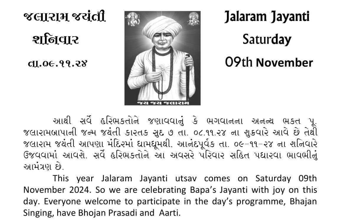 This year Jalaram Jayanti utsav comes on Saturday 09th November 2024. So we are celebrating Bapa’s Jayanti with joy on this day. Everyone welcome to participate in the day’s programme, Bhajan